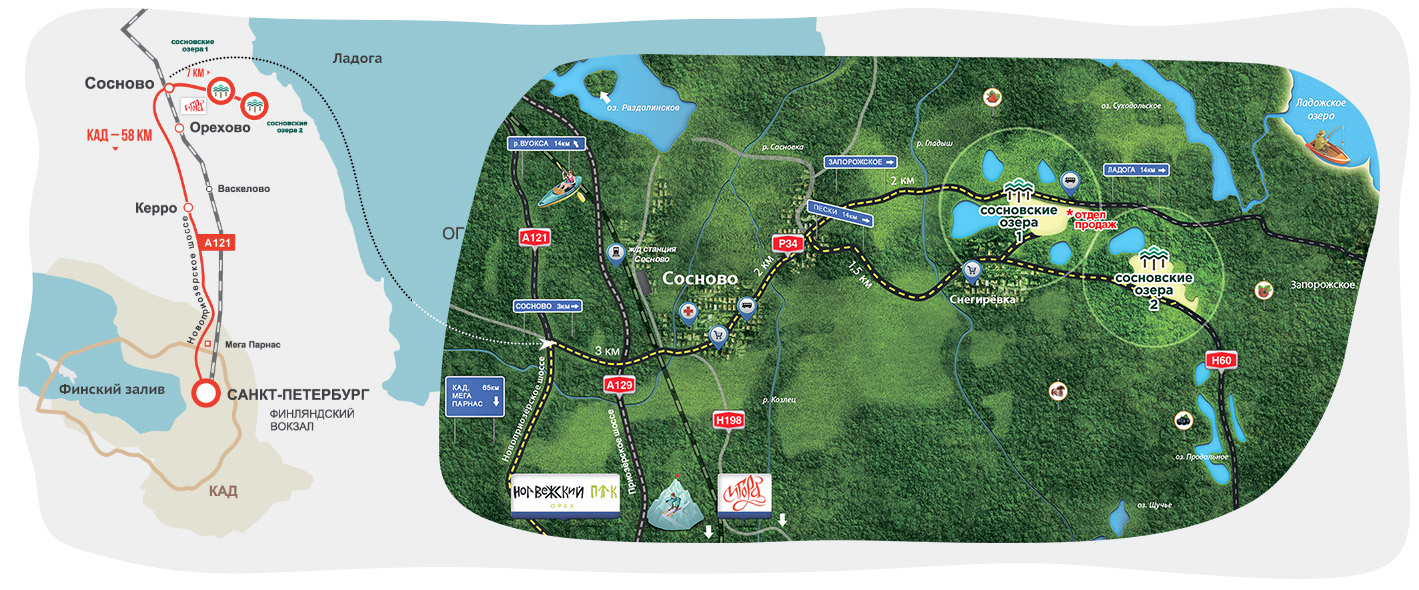 Такое расположение идеально подходит для загородного отдыха: приятная удаленность от городской суеты и привычная инфраструктура в комфортной близости. Спокойный дачный отдых легко разнообразить: в 5 минутах езды от поселков находится горнолыжный курорт «Игора»,в 9 км около Орехово находится веревочный парк «Норвежский парк Орех», в 10 минутах – пляжи Ладожского озера, а если поехать в Приозерском направлении в 16 км будут пороги реки Вуоксы.