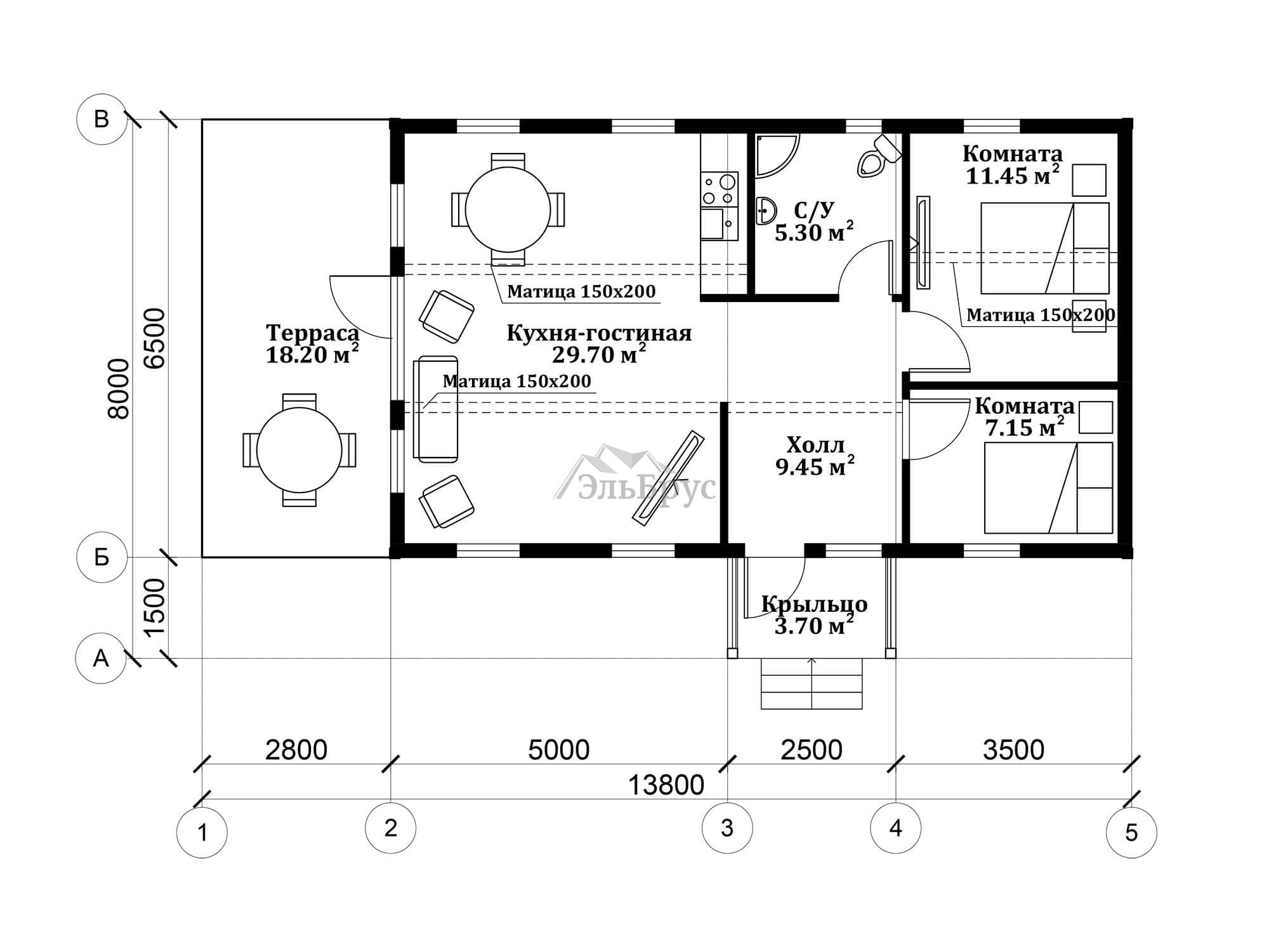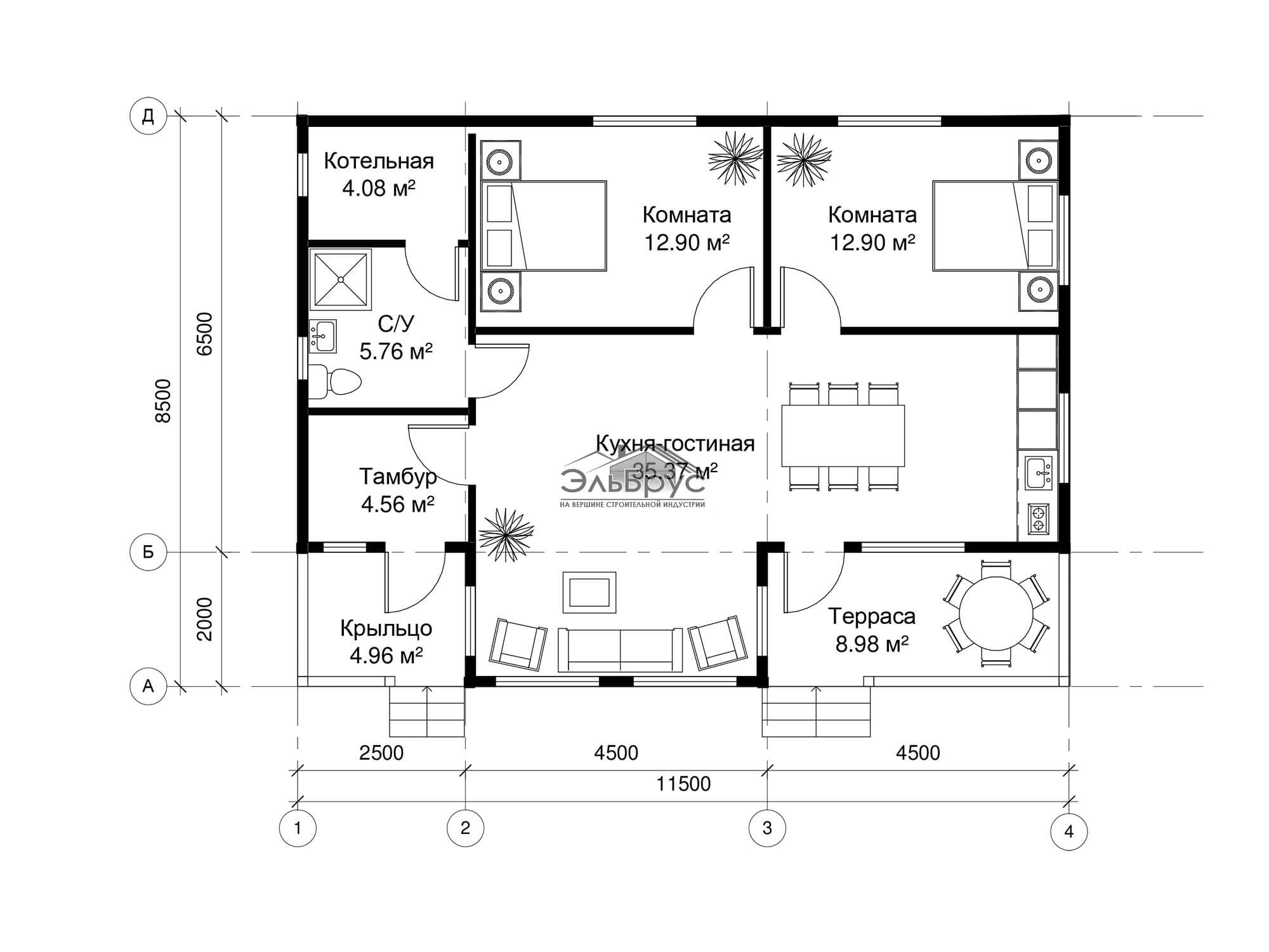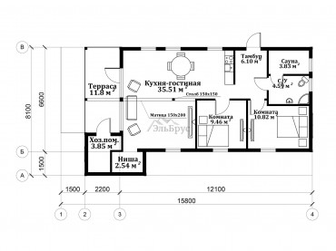 Проект ЭльБрус КД 054 придется по вкусу тем, кто выбирает просторные одноэтажные дома, ценит комфорт и отдает предпочтение продуманным стилистическим решениям. Большая кухня-гостиная и 2 комнаты обеспечивают простор. Терраса будет идеальным решением для отдыха всех членов семьи. Оптимальное количество окон позволяет наполнить все помещения достаточным количеством света. В вашем доме всегда будет комфортно, уютно и тепло. Выбрав этот проект, вы не будете искать компромиссы между простором и эргономикой комнат.